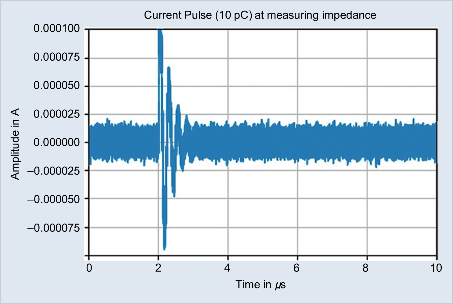 در واقع با استقاده از یک انتگزال گیر الکترونیکی می توان شدت تخلیه جزئی رخ داده را در حوزه ی زمانی بدست آورد شکل زیر نشان دهنده ی پالس جریان در حوزه ی زمان است که روی امپدانس اندازه گیری دیده خواهد شد.